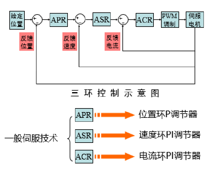 伺服是一個(gè)閉環(huán)系統(tǒng),它是由電流環(huán)、速度環(huán)、位置環(huán)組成,位置環(huán)的輸出作為速度環(huán)的給定,速度環(huán)的輸出又是電流環(huán)的給定。